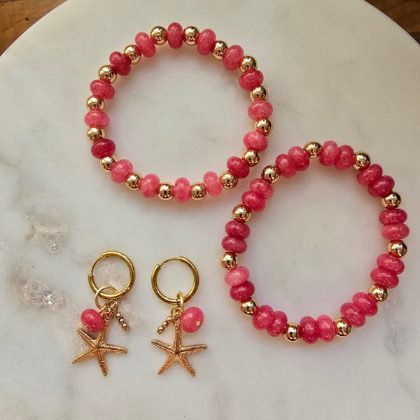 De oorbellen zijn subtiel, speels en zacht van kleur, met een gouden ringetje, verfijnde details en een schattig zeesterhangertje. De armband is de perfecte match, met dezelfde rustgevende watermeloen chalcedoon, een steen die je helpt ontspannen, je hart opent en je eraan herinnert om te genieten van het nu. 🍉